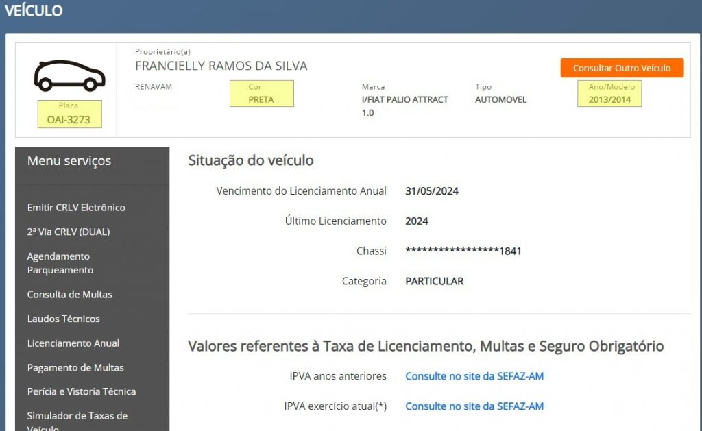 Quanto ao veículo, segundo a investigação, é de propriedade de Rilza Tavares da Silva Lima e tem como emplacamento original PHH-7095. O veículo, que tinha sido dado como roubado, consta no site do Departamento Estadual de Trânsito (Detran-AM) com as mesmas características do registro da placa adulterada.