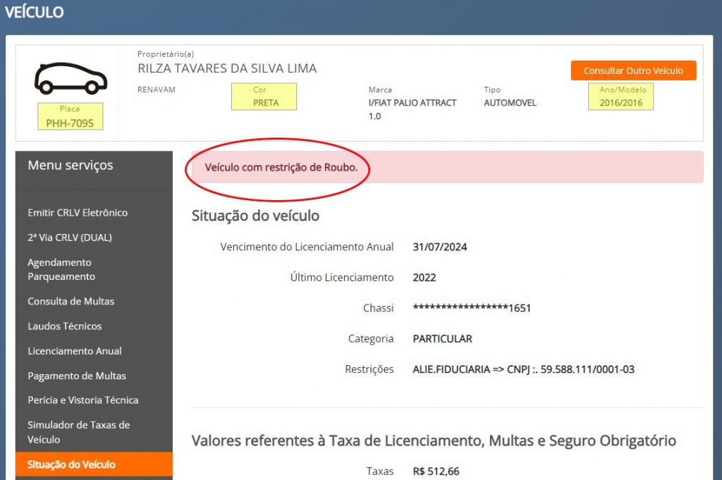 Esclareço que me foi repassado um documento com todas as informações do automóvel em nome da suposta primeira proprietária do veículo. De forma cuidadosa, fiz uma consulta com os dados fornecidos pelo vendedor e o veículo não tinha nenhuma restrição, ou seja, estava em situação regular.