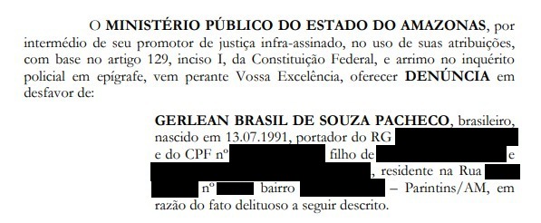 A denúncia foi apresentada em julho deste ano. No documento, consta que Gerlean foi preso em flagrante em Parintins, no dia 17 de junho deste ano, após denúncia anônima, em posse de um veículo modelo Fiat Palio Atrative, placa OAI-3273, cor preta, que circulava com placa adulterada no bairro Palmares. Após a abordagem, foi constatado que havia adulterações no vidro, no Chassi e no motor do carro.