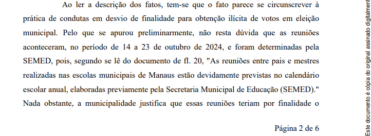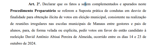 “Os fatos a serem complementados e apurados neste Procedimento Preparatório se referem a Suposta prática de condutas em desvio de finalidade para obtenção ilícita de votos em eleição municipal, consistente na realização de reuniões irregulares nas escolas municipais de Manaus entre gestores e pais de alunos, para, de forma velada ou explícita, pedir votos em favor do então candidato à reeleição”, diz trecho do documento. Veja: