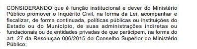 O documento afirma, também, que é função institucional e dever do Ministério Público promover o Inquérito Civil, na forma da Lei, acompanhar e fiscalizar, de forma continuada, políticas públicas ou instituições do Estado ou do município, de suas administrações indiretas ou fundacionais, ou de entidades privadas de que participem do Conselho Superior do Ministério Público.