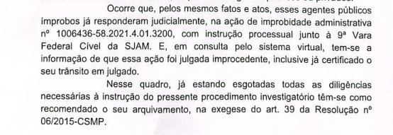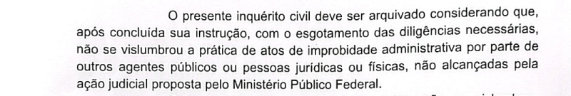“O presente inquérito civil deve ser arquivado considerando que após concluída sua instrução, com o esgotamento das diligências necessárias, não se vislumbrou a prática de atos de improbidade administrativa por parte de outros agentes públicos ou pessoas jurídicas ou físicas, não alcançadas pela ação judicial proposta pelo Ministério Público Federal”, consta na decisão.