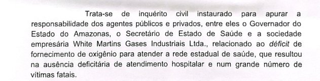 O inquérito civil 06.2021.00000187-7, agora arquivado, investigou a responsabilidade de agentes públicos e privados, entre eles, o governador do Estado, o secretário de Saúde e a empresa fornecedora de oxigênio White Martins pelo déficit de fornecimento do insumo para atender a rede estadual de saúde, o que resultou na falta de atendimento hospitalar e, consequentemente, em mortes.