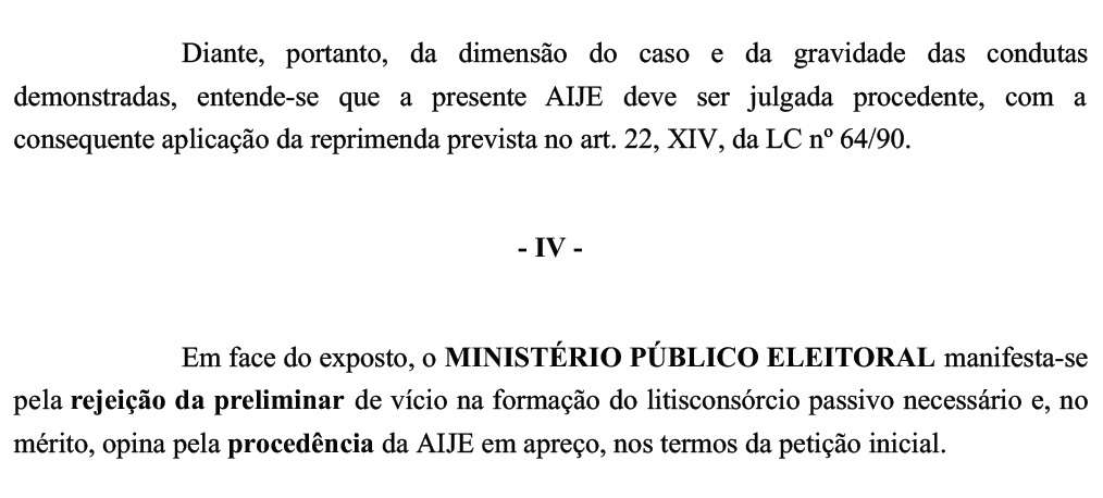 “Cumpre registrar, por derradeiro, que as condutas narradas na exordial revestem-se de notória e demasiada gravidade. Em vista disso, a aplicação da reprimenda deve ser compatível com a gravidade do caso concreto, observando-se o princípio da proporcionalidade. Diante, portanto, da dimensão do caso e da gravidade das condutas demonstradas, entende-se que a presente Aije deve ser julgada procedente”, avaliou o procurador.