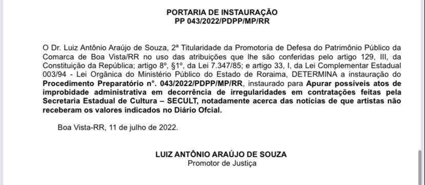 “Determina a instauração do Procedimento Preparatório N° 043/2022/PDPP/MP/RR instaurado para Apurar possíveis atos de improbidade administrativa em decorrência de irregularidades em contratações feitas pela Secretaria Estadual de Cultura – Secult, notadamente acerca das notícias de que artistas não receberam os valores indicados no Diário Oficial”, diz trecho do procedimento.