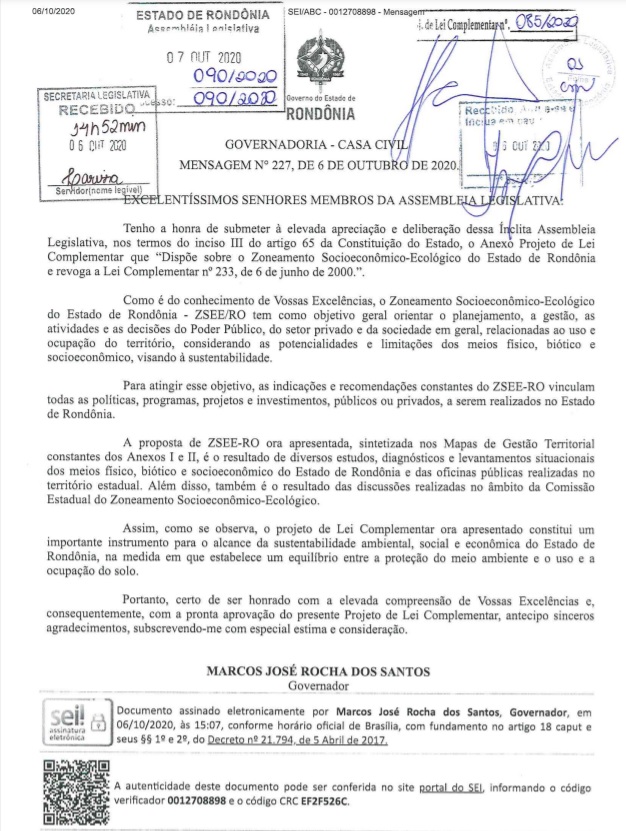 De autoria do governador de Rondônia, Coronel Marcos Rocha (em transição para o União Brasil), e com emendas de deputados estaduais, o PLC nº 085 foi aprovado na ALE-RO, em 28 de setembro, às pressas, após audiência pública marcada pela presença massiva de ruralistas em Porto Velho.