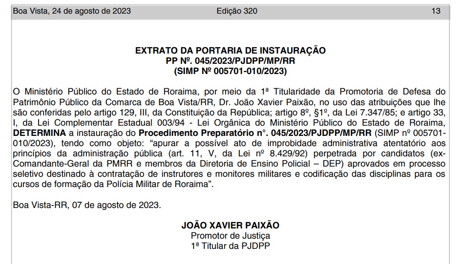 Cinco meses após a formalização das denúncias, o Ministério Público de Roraima (MPRR) publicou, na edição de quinta-feira, 24, do Diário Oficial do órgão, a instauração do procedimento que “irá apurar o possível ato de improbidade administrativa atentatório aos princípios da administração pública (art. 11, V, da Lei N° 8.429/92)”.
