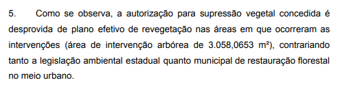O procurador diz, ainda, que a autorização para retirada das árvores foi realizada sem um plano de ação, “contrariando tanto a legislação ambiental estadual quanto municipal de restauração florestal no meio urbano”.