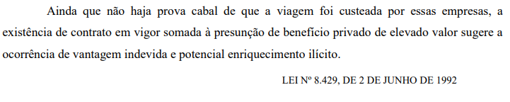 “Ainda que não haja prova cabal de que a viagem foi custeada por essas empresas, a existência de contrato em vigor somada à presunção de benefício privado de elevado valor sugere a ocorrência de vantagem indevida e potencial enriquecimento ilícito“, diz trecho da representação inicial. Veja: