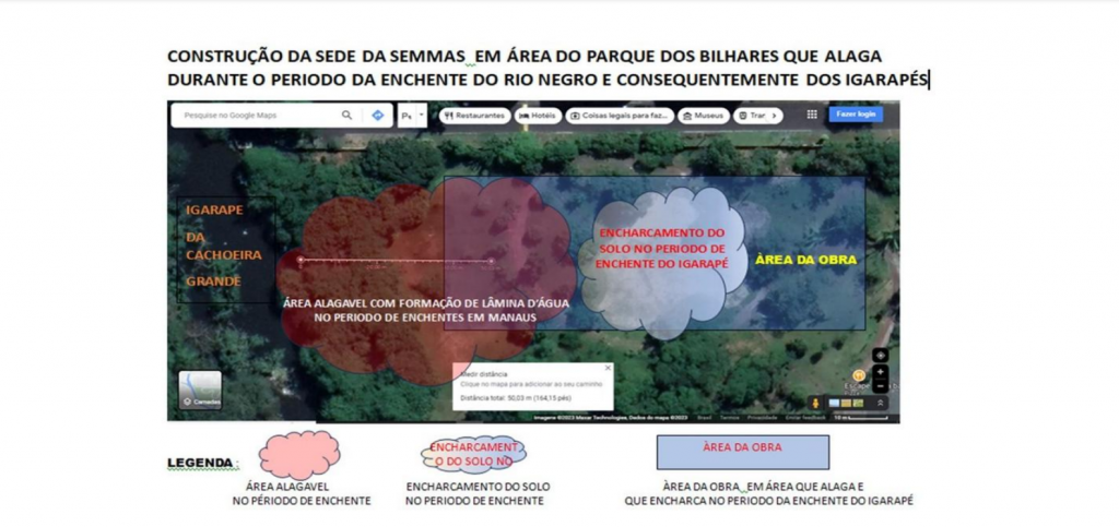 Uma imagem de satélite, retirada do GoogleMaps, mostra o local da nova sede da Semmasclima próximo a uma área alagável no período de enchentes. O local fica ao lado do igarapé da Cachoeira Grande, como mostra a imagem.