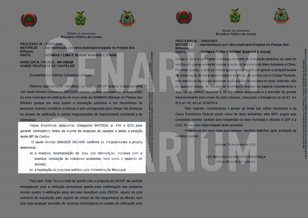 MANAUS (AM) – Um laudo técnico do Ministério Público de Contas (MPC) apontou possível ilicitude e má gestão do Instituto de Proteção Ambiental do Amazonas (Ipaam), sobre as licenças ambientais paras as obras de construção da sede da Secretaria Municipal de Meio Ambiente, Sustentabilidade e Mudança do Clima (Semmasclima), localizado no Parque Municipal Ponte dos Bilhares, na Zona Oeste de Manaus.