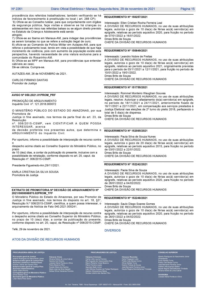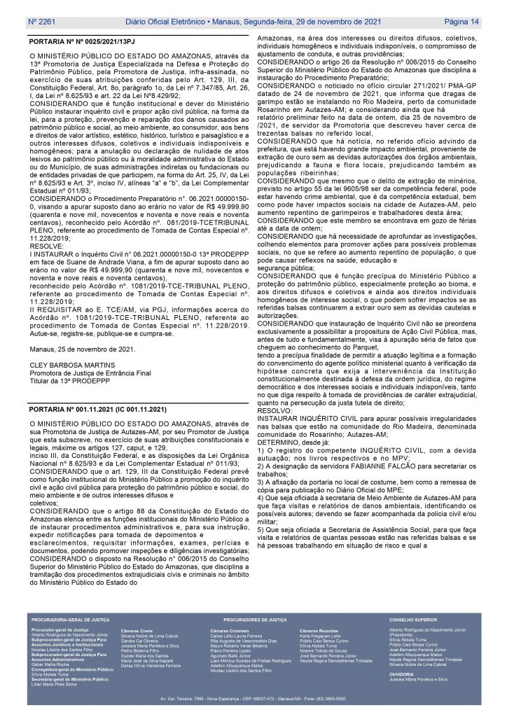 A portaria de abertura do procedimento está publicada na edição de 29 de novembro do Diário Oficial do Ministério Público do Amazonas, páginas 14 e 15.