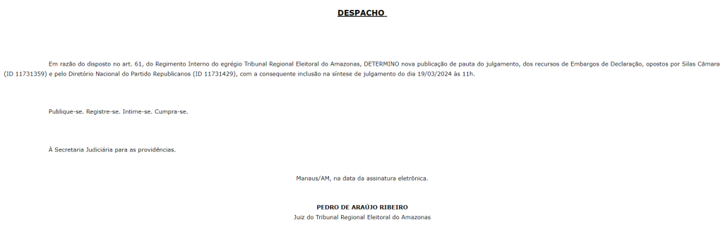 O MPE contestou os argumentos apresentados por Silas e pelo Republicanos. Os embargos de declaração estavam prontos para serem apresentados, mas foram retirados pelo relator do processo, o juiz do TRE-AM, Pedro de Araújo Ribeiro. A nova data para inclusão será no próximo dia 19, terça-feira.
