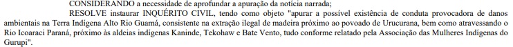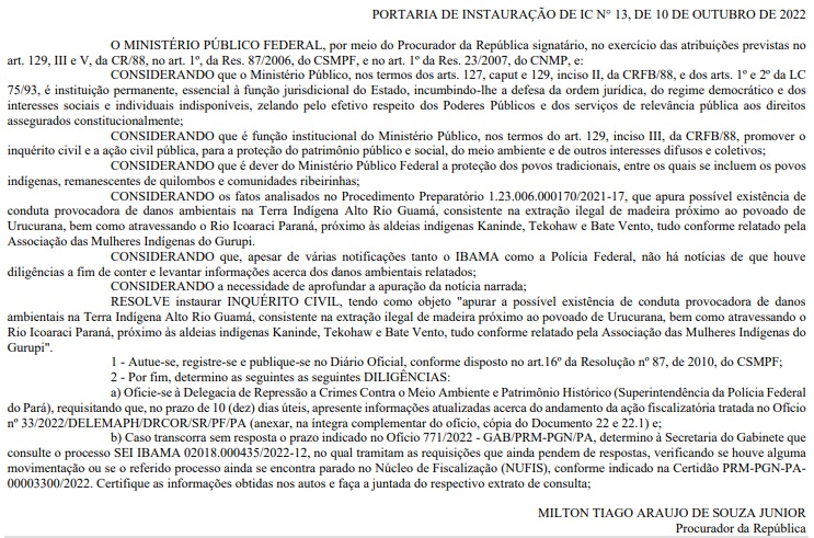 Segundo o MPF, a denúncia sobre os danos ambientais foi relatada pela Associação das Mulheres Indígenas do Gurupi (Aming). Além de chegar ao Alto Rio Guamá, a extração ilegal de madeira ocorreu próximo ao povoado de Urucurana e às aldeias indígenas Kaninde, Tekohaw e Bate Vento. A portaria de investigação foi publicada no Diário Oficial Eletrônico do MPF e assinada pelo procurador da República Milton Tiago Araújo de Souza Júnior.