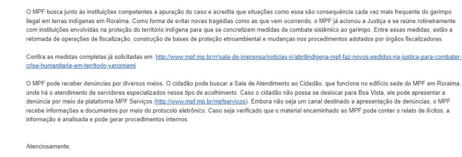“Embora não seja um canal destinado à apresentação de denúncias, o MPF recebe informações e documentos por meio do protocolo eletrônico. Caso seja verificado que o material encaminhado ao MPF pode conter o relato de ilícitos, a informação é analisada e pode gerar procedimentos internos”, esclareceu o MPF.
