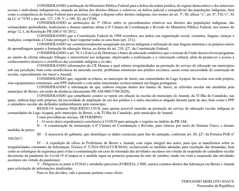 A portaria de investigação foi publicada no Diário Oficial do MPF e assinada pelo Procurador da República Fernando Soave. O promotor determinou que as prefeituras de Anamã e Beruri se manifestem sobre o caso, esclarecendo as medidas adotadas para resolução das demandas.
