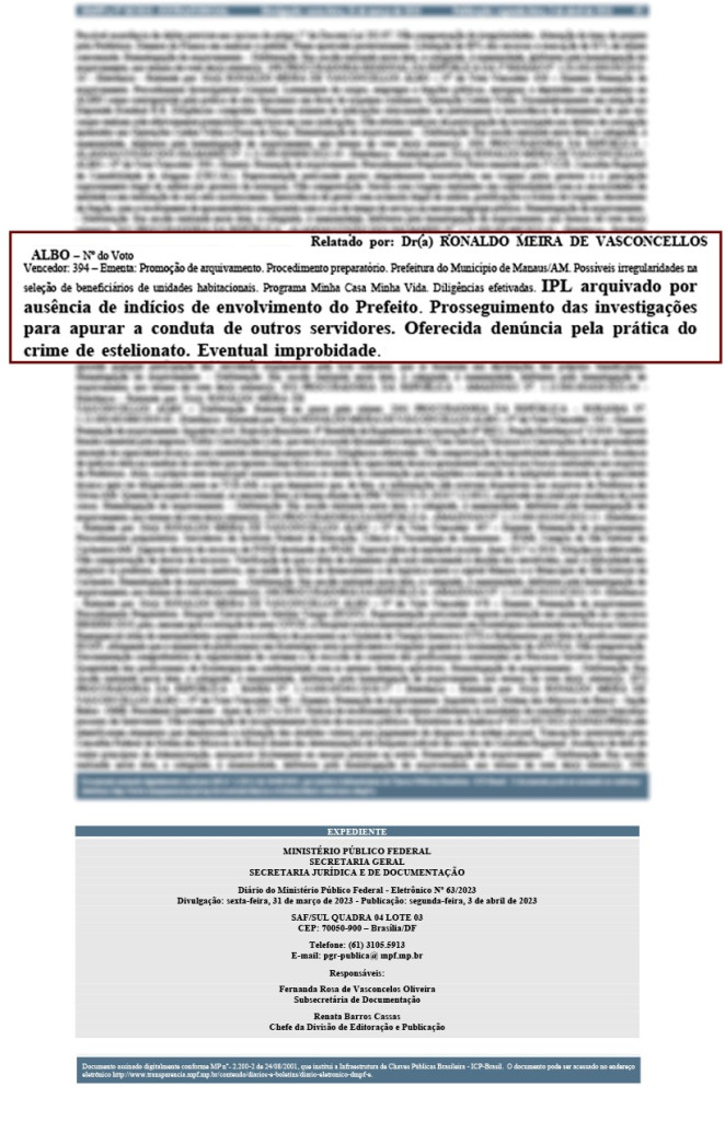 MANAUS – O Ministério Público Federal, no Amazonas (MPF-AM), arquivou um inquérito contra o prefeito de Manaus, David Almeida (Avante), que apurava “possíveis irregularidades” na seleção de famílias beneficiárias de unidades habitacionais do “Programa Minha Casa Minha Vida” por ausência de indícios.