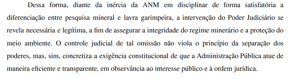 “Diante da inércia da ANM em disciplinar de forma satisfatória a diferenciação entre pesquisa mineral e lavra garimpeira, a intervenção do Poder Judiciário se revela necessária e legítima, a fim de assegurar a integridade do regime minerário e a proteção do meio ambiente. O controle judicial de tal omissão não viola o princípio da separação dos poderes, mas, sim, concretiza a exigência constitucional de que a Administração Pública atue de maneira eficiente e transparente”, diz trecho do documento. Veja: