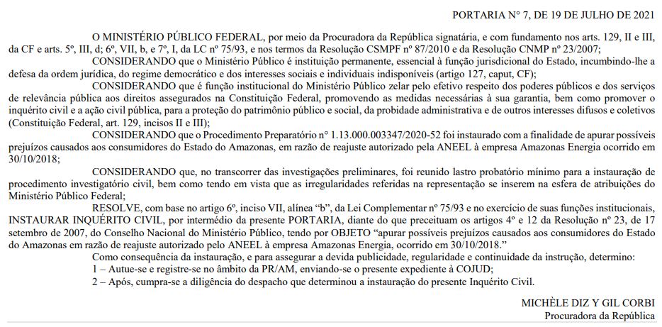 “O Procedimento Preparatório n° 1.13.000.003347/2020-52 foi instaurado com a finalidade de apurar possíveis prejuízos causados aos consumidores do Amazonas, em razão de reajuste autorizado pela Aneel à Amazonas Energia ocorrido em 2018 e que, no transcorrer das investigações preliminares, foi reunido lastro probatório mínimo para a instauração de procedimento investigatório civil”, afirmou Corbi no texto.