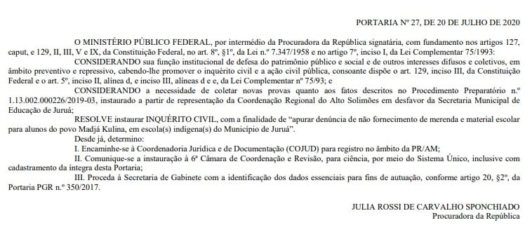 De acordo com a portaria nº 27, de 20 de julho de 2020, publicada no Diário Oficial do MPF da quinta-feira, 24, e assinada pela procuradora da República, Júlia Rossi de Carvalho Sponchiado, a denúncia aponta ainda o não fornecimento de material escolar. Os alunos afetados são do povo Madjá Kulina.