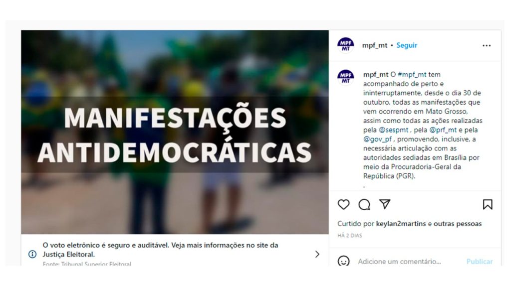 O Ministério Público Federal (MPF) do Mato Grosso classifica as manifestações contrárias aos resultados das eleições como atos inegavelmente antidemocráticos. “A recusa do resultado das urnas é um ato inequivocamente antidemocrático, independentemente do que seja pedido como alternativa ao processo eleitoral legítimo”, ressaltou o procurador-chefe substituto do MPF-MT, Ricardo Pael, que tem participado de reuniões com órgãos estaduais e federais em Mato Grosso.