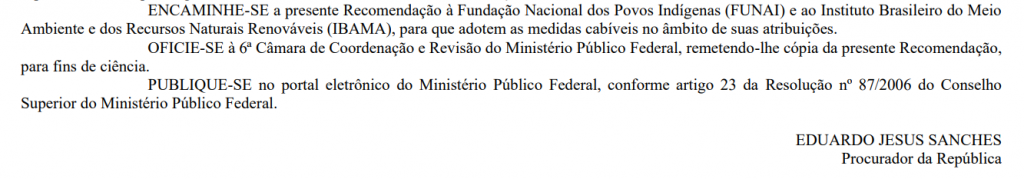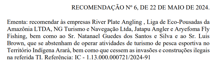 O documento, redigido pelo procurador Eduardo Jesus Sanchez é direcionado às companhias River Plate Angling, Liga de Eco-Pousadas da Amazônia LTDA, NG Turismo e Navegação Ltda, Jatapu Angler e Aryefoma Fly Fishing, além dos empresários Natanael Guedes dos Santos e Luís Brown.
