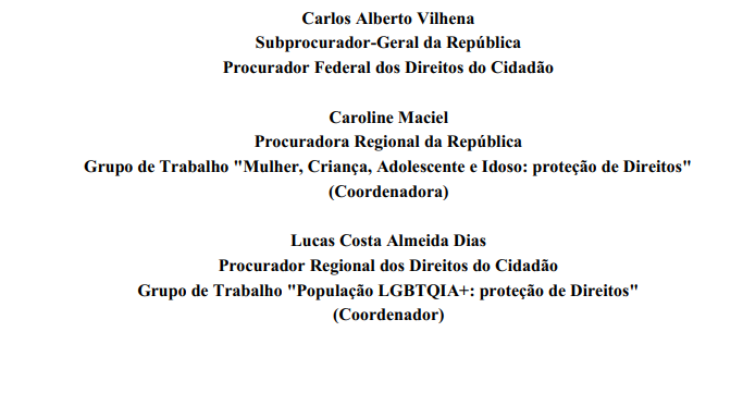 A nota assinada pelo procurador federal dos Direitos do Cidadão, Carlos Alberto Vilhena, pela procuradora regional da República, Caroline Maciel – coordenadora do Grupo de Trabalho (GT) Mulher, Criança, Adolescente e Idoso: proteção de direitos; e pelo procurador da República, Lucas Costa Almeida Dias – coordenador do GT População LGBTQIA+: proteção de direitos destaca o compromisso com a defesa da dignidade humana.