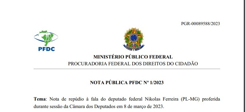 “A imunidade de um congressista não pode ser escudo para a disseminação de discursos que semeiem preconceitos e desinformação entre a população brasileira. Nesse sentido, a PFDC apoia a iniciativa da Procuradoria Regional dos Direitos do Cidadão no Distrito Federal (PRDC/DF), no sentido de o Ministério Público Federal (MPF) apurar a responsabilização cível (dano moral coletivo) e/ou criminal do deputado Nikolas Tavares, por prática e/ou incitação à discriminação por motivo de gênero”, garante a PDFC.