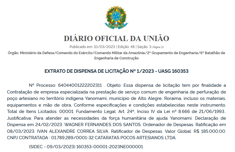 O 6º Batalhão de Engenharia de Construção contratou a empresa Cataratas, em 10 de março, por dispensa de licitação, como consta no Diário Oficial da União (DOU), para construir um poço artesiano no 4º Pelotão Especial de Fronteira (4º PEF), na região de Surucucu, ao custo de R$ 185 mil. Posteriormente, a mesma companhia foi contratada pela Secretaria Especial de Saúde Indígena (Sesai) para instalar um poço na Unidade Básica de Saúde Indígena de Surucucu, que fica próxima ao 4º PEF.