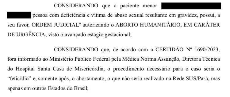 Em nota, a Fundação Santa Casa de Misericórdia do Pará informou “que não houve negativa para a realização do procedimento, mas sim, a solicitação da presença de um responsável, por se tratar de uma menor e com deficiência. A paciente já está internada na Santa Casa para a realização do aborto”.