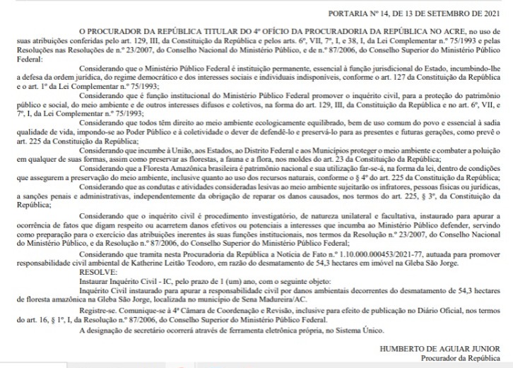 A portaria de investigação foi publicada, nesta quarta-feira, 15, no Diário Oficial do MPF, e assinada pelo procurador da República Humberto de Aguiar Junior. Com uma população estimada em 46.511 habitantes e um território de 25.278 km², Sena Madureira é uma das cidades que mais desmatam na Amazônia.