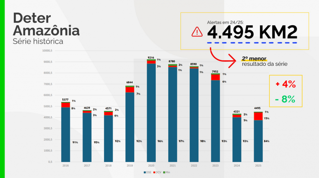 Conforme os dados do Deter/Inpe, as áreas sob alerta de desmatamento na Amazônia atingiram 4.495 km², em 12 meses, contra 4.321 km² registradas de agosto de 2023 a 2024, o segundo menor nível da série histórica. O problema de agora é o aumento da área desmatada por incêndios florestais, que saiu de 5% para 15% de um período para outro.