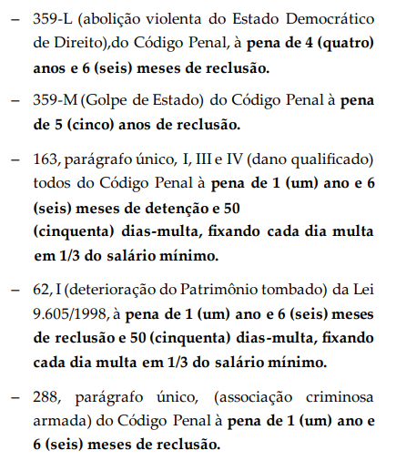 Na denúncia apresentada pela Procuradoria-Geral da República e acatada pela Justiça Federal, são listados cinco crimes: abolição violenta do Estado Democrático de Direito (art. 359-L do CP); tentativa de golpe de Estado (art. 359-M); dano qualificado com violência (art. 163, parágrafo único, I, III e IV); associação criminosa armada (art. 288, parágrafo único); e deterioração de patrimônio tombado (art. 62, I, da Lei 9.605/98).