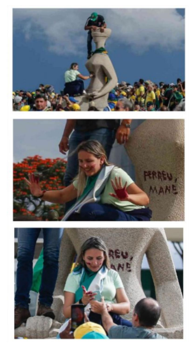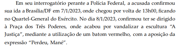 Em interrogatório à Polícia Federal, após ser presa, Débora confirmou que vandalizou a estátua em frente ao STF, utilizando um batom vermelho, com o qual escreveu “Perdeu, mané”.
