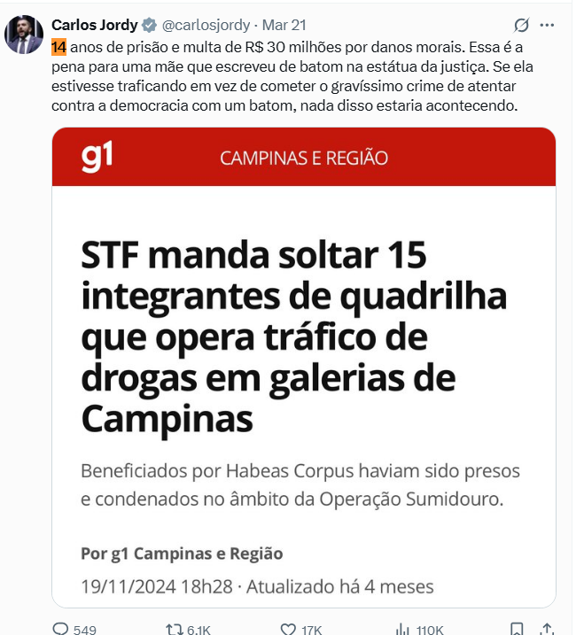 Um parlamentar que se manifestou foi o deputado federal Carlos Jordy. “14 anos de prisão e multa de R$ 30 milhões por danos morais. Essa é a pena para uma mãe que escreveu de batom na estátua da Justiça. Se ela estivesse traficando em vez de cometer o gravíssimo crime de atentar contra a democracia com um batom, nada disso estaria acontecendo“, declarou.