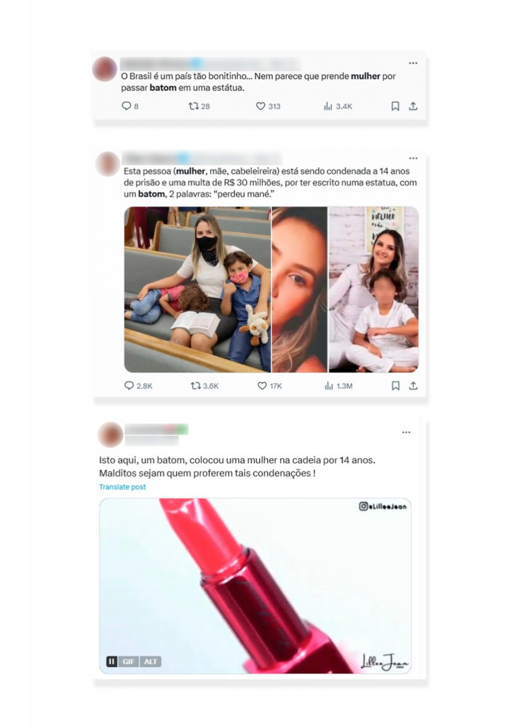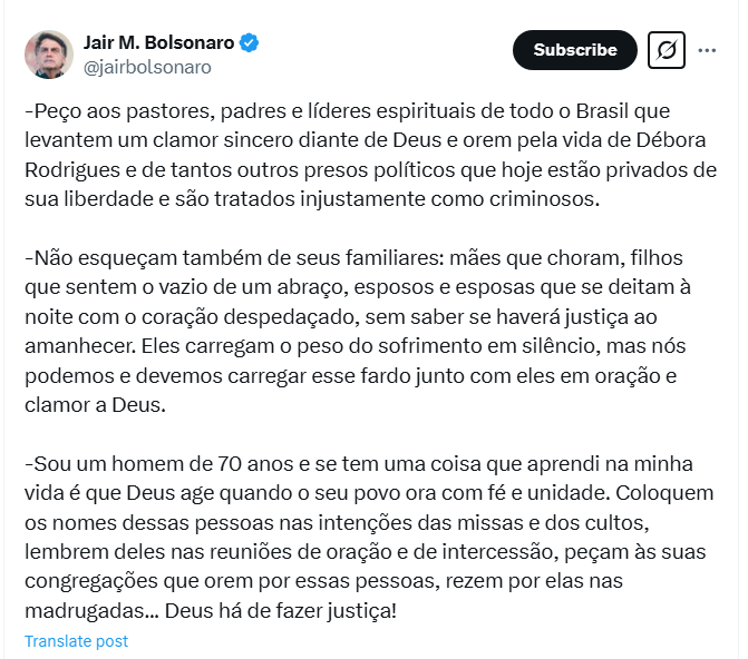 Diante do julgamento, internautas e parlamentares aliados a Jair Bolsonaro (PL), além do próprio ex-mandatário, se manifestaram sobre a possível condenação de Débora. Neste domingo, 23, o ex-presidente usou as redes sociais para pedir orações a “pastores, padres e líderes espirituais de todo o Brasil” para os presos pelos ataques golpistas de 8 de janeiro, citando o caso da cabeleireira.