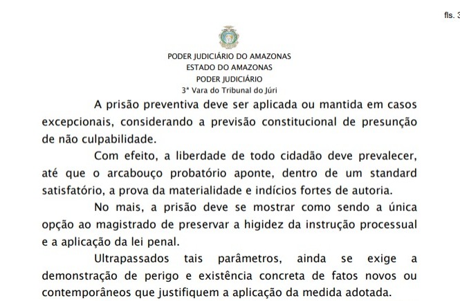Na justificativa, a juíza afirma que a prisão preventiva deve ser aplicada ou mantida apenas em casos excepcionais, e que a liberdade de todo cidadão deve prevalecer sejam apresentadas provas de materialidade e indícios fortes de autoria.