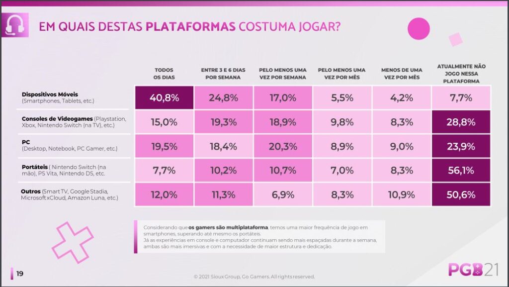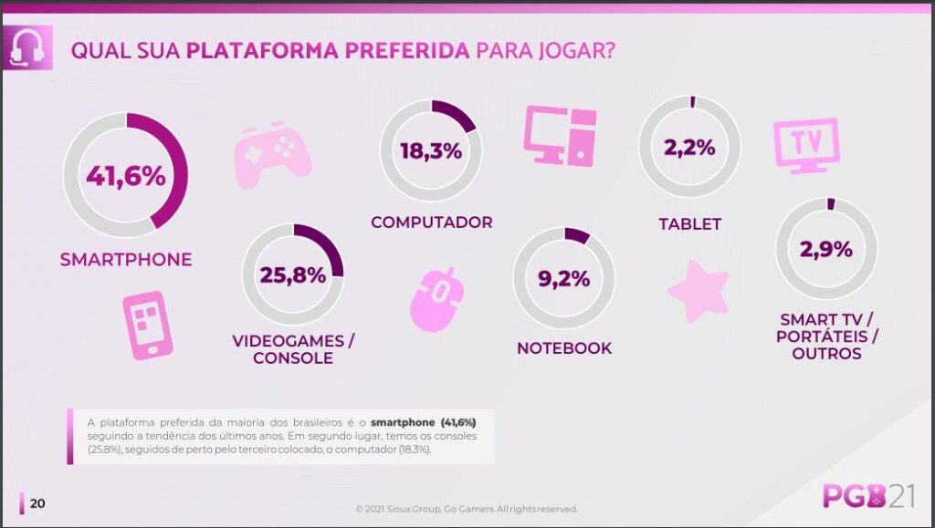 No levantamento também foi revelado que 72% dos brasileiros têm o costume de jogar jogos eletrônicos, independente da plataforma. Já a dominância feminina em jogos mostra ainda que a quantidade de jogadores é compatível com índices demográficos, equivalentes às características gerais da população do Brasil. Ou seja, a população é mais feminina, com grande hábito de jogar, confirmando esta tendência.