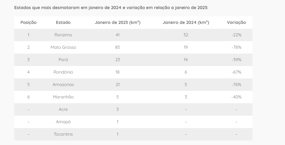 Sem o recorte por Unidade de Conservação (UC), o desmatamento caiu 60% na Amazônia Legal. A maior queda foi no Mato Grosso, com 78%, na comparação entre janeiro de 2023 e janeiro de 2024, seguido por Amazonas (76%); Rondônia (67%); Maranhão (67%).