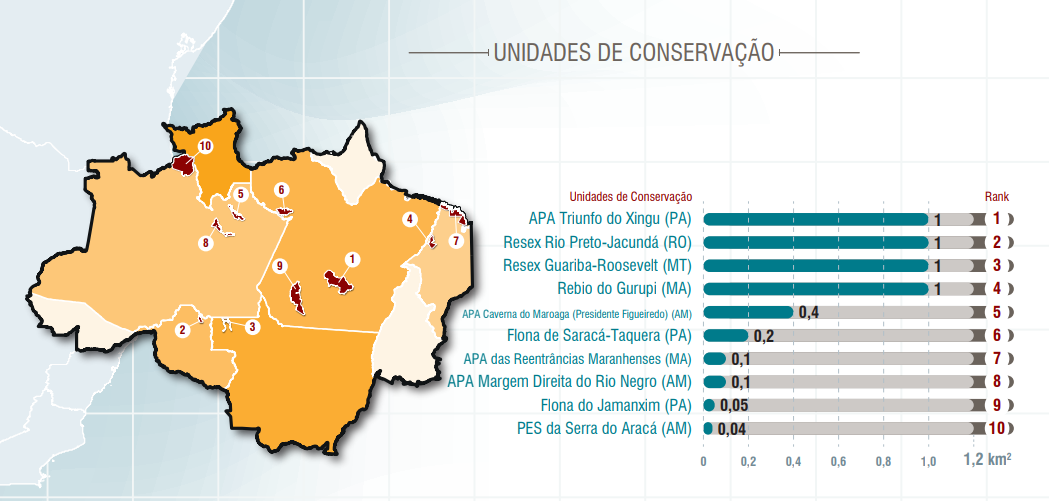 Entre as dez primeiras posições do ranking, o o território paraense ocupa três colocações, com a Área de Proteção Ambiental (APA) Triunfo do Xingu ocupando o primeiro lugar. Em seguida, aparece a Reserva Extrativista Rio Preto-Jacundá (Resex Rio Preto-Jacundá), em Rondônia, e a Resex Guariba-Roosevelt, no Mato Grosso.