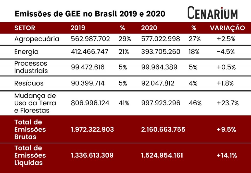 O desmatamento na Amazônia e no Cerrado, somado, chega a quase 90% das emissões nesse setor. Segundo o relatório, essas mudanças de uso da terra emitiram 998 milhões de toneladas de CO2, em 2020, chegando a um aumento de 24% em relação a 2019.