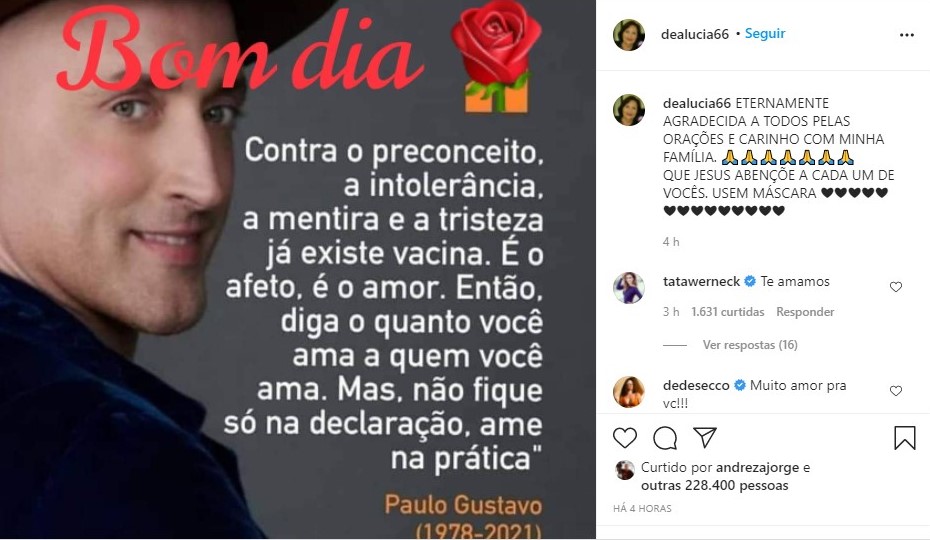 A mensagem é acompanhada por uma imagem com a foto de Paulo Gustavo. Ao lado, lê-se a reprodução de um depoimento proferido pelo ator durante uma entrevista a um portal de notícias, já durante a pandemia: “Contra o preconceito, a intolerância, a mentira e a tristeza existe vacina. É o afeto, é o amor. Então, diga o quanto você ama a quem você ama. Mas, não fique só na declaração, ame na prática”.
