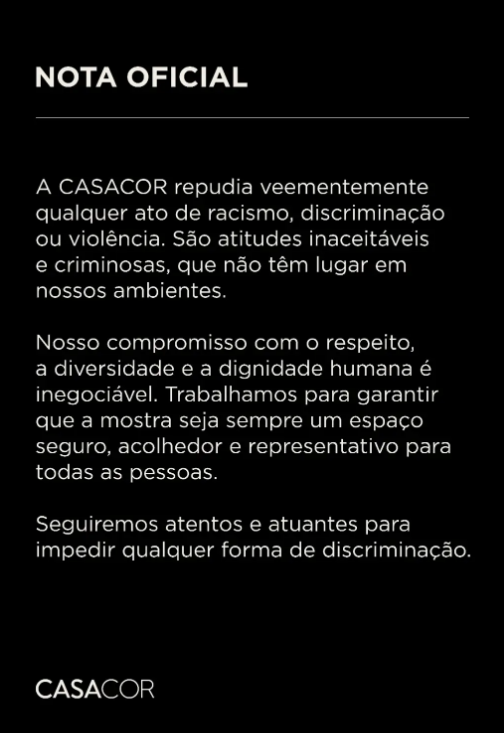 A Polícia Militar foi acionada e um boletim de ocorrência foi registrado com a presença da mulher. O caso será investigado como injúria racial. Em nota, a organização da Casacor classificou o episódio como inaceitável e criminoso, e afirmou que declarações desse tipo “não têm lugar em nossos ambientes”. A empresa também prestou apoio imediato ao arquiteto.