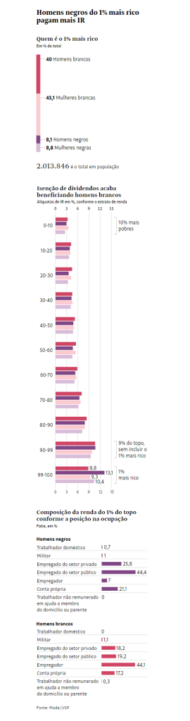 Um dos autores do estudo, o economista Matias Rebello Cardomingo afirma que o achado evidencia a discriminação implícita na tributação sobre a renda no Brasil. “Ao desonerar um tipo de renda como os lucros e dividendos, o grupo beneficiado é nitidamente o das pessoas brancas do topo“, diz.
