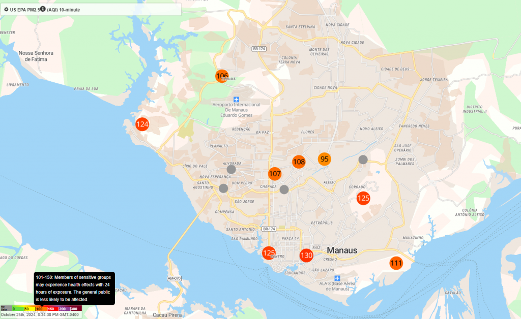 MANAUS (AM) – Os sistemas de monitoramento de qualidade do ar, na noite desta sexta-feira, 25, tornaram a mostrar níveis elevados de micropartículas poluentes no ar em Manaus. O aplicativo Purple Air, registrou a qualidade laranja para o ar na capital amazonense, com piora nos bairros Coroado, Zona Leste da cidade, Cachoeirinha, na Zona Sul e Tarumã, localizado na Zona Norte.