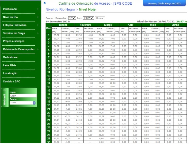 MANAUS – O nível do Rio Negro continua aumentando, segundo dados oficiais divulgados pelo site do Porto de Manaus. Desde janeiro até 28 de março, o nível das águas passou de 24,15 para 26,87. Um aumento de pouco mais de 2,70 centímetros. Embora esteja 23cm abaixo em relação ao mesmo período do ano passado, quando o nível do rio marcava 27,10, a subida fluvial ascende um alerta para a possibilidade de uma grande cheia.