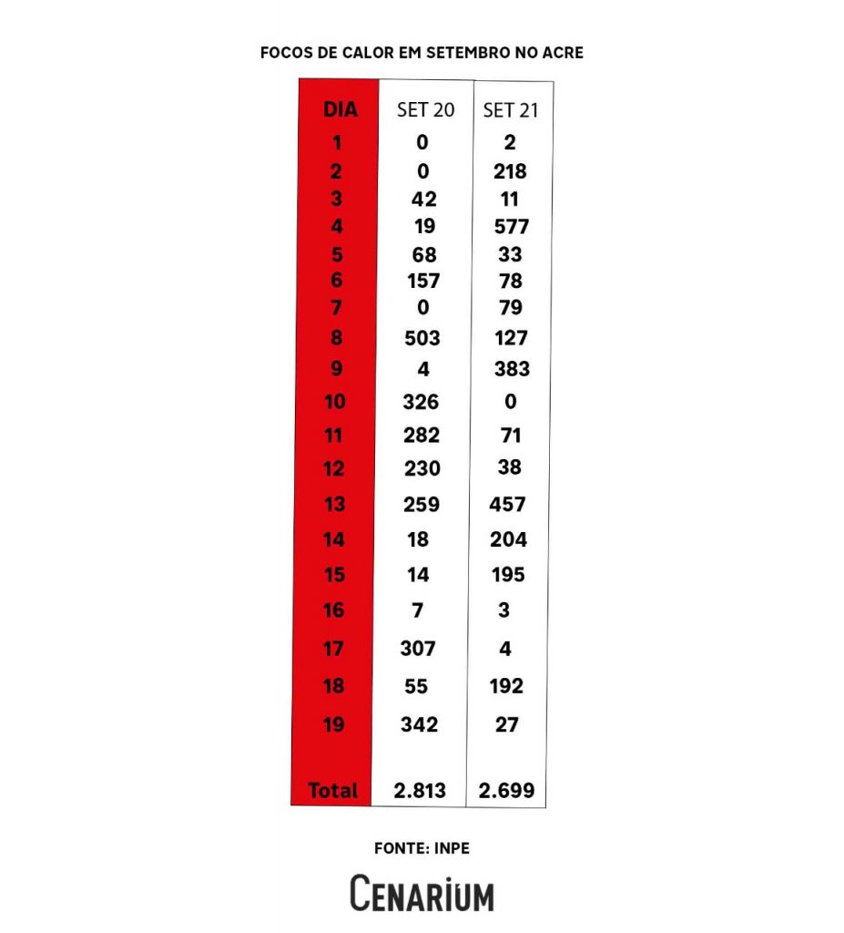 A diferença dos períodos é de 86 focos de calor. No comparativo dos dias do mês deste ano, a data em que o bioma amazônico mais pegou fogo no Acre ocorreu dia 4 de setembro, com 577 focos registrados pelo Inpe. Em 2020, foi o dia 8, com 503 focos. (Veja a tabela abaixo)