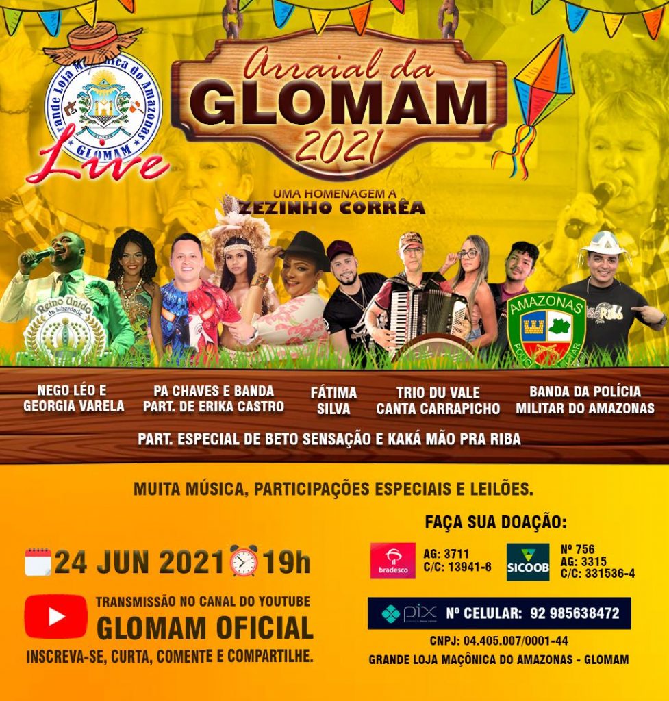 MANAUS – Pelo segundo ano seguido, os tradicionais festejos juninos precisam passar por adaptações por conta da pandemia da Covid-19. É assim com o arraial solidário da Grande Loja Maçônica do Amazonas (Glomam), que será realizado de forma online no próximo dia 24 de junho. A edição de 2021 visa arrecadar doações para famílias afetadas pela enchente, em Manaus, e faz uma homenagem ao cantor e compositor Zezinho Corrêa, vítima da Covid-19, principal atração do arraial no ano passado.