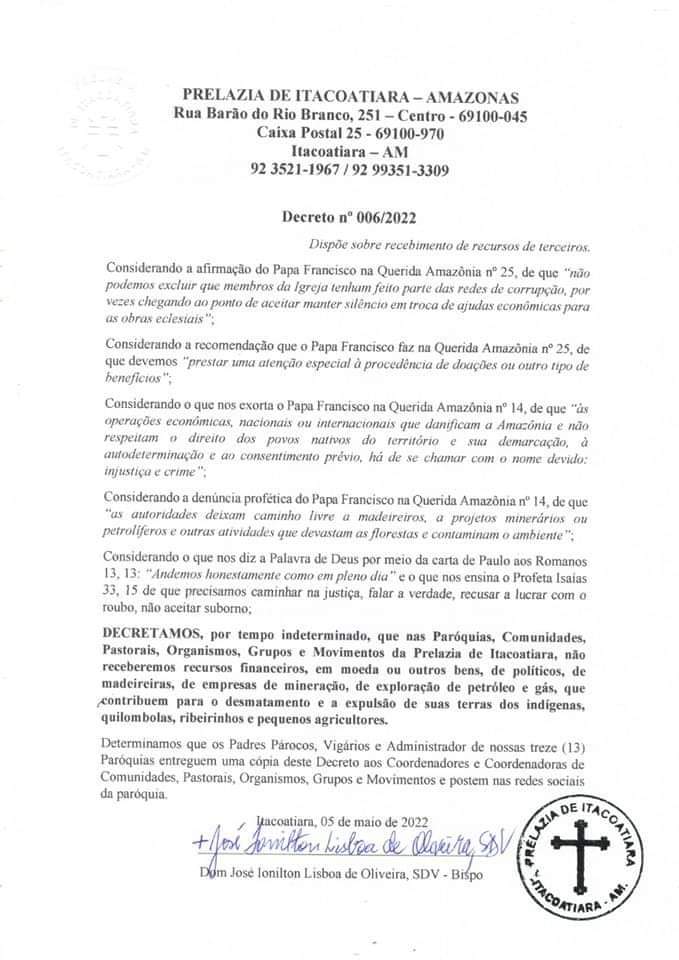 De acordo com o documento, a medida deve vigorar por tempo indeterminado e é válida para empresas que contribuem para o desmatamento e a expulsão de indígenas, quilombolas, ribeirinhos e agricultores de suas terras. No decreto, o bispo Dom Ionilton determinou que padres, párocos, vigários e administradores das 13 paróquias da prelazia entreguem a decisão para as comunidades.