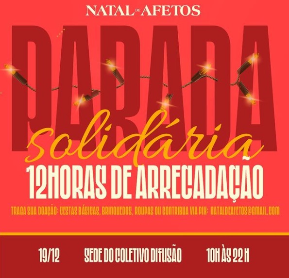 MANAUS – Com mais de 15 anos de militância na cultura amazonense, o movimento ‘Coletivo Difusão’ realiza 12 horas seguidas de ‘parada solidária’, neste domingo, 19, na rua Guapiaçu, no bairro Cidade Nova, Zona Norte de Manaus, para arrecadar alimentos e ajudar famílias carentes contra a fome. A ação faz parte da “Campanha Natal de Afetos”, que deve beneficiar 550 grupos familiares. O evento terá início às 10h e vai até 22h.